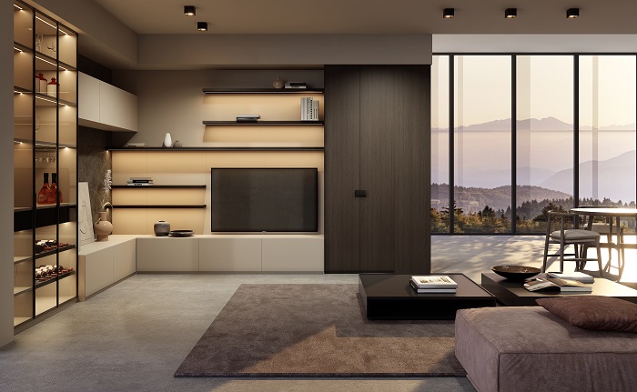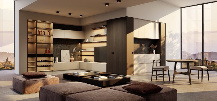 系列遵循少即是多的原则,以烤漆和原木色为主,穿插大理石云纹点缀,通过线条和平面的修饰,彰显现代极简主义的艺术格调。