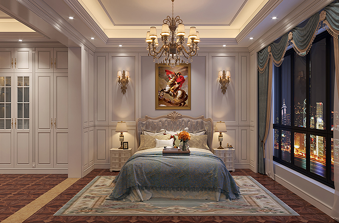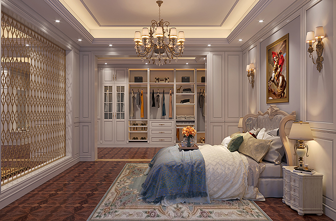 主卧空间的装饰没有动用太多笔墨,一幅竹林画搭配地面木纹,轻易将中式的美感勾勒出来。独立的衣帽间,根据墙面内嵌,对空间充分利用,把那些边角的空间也都变废为宝。