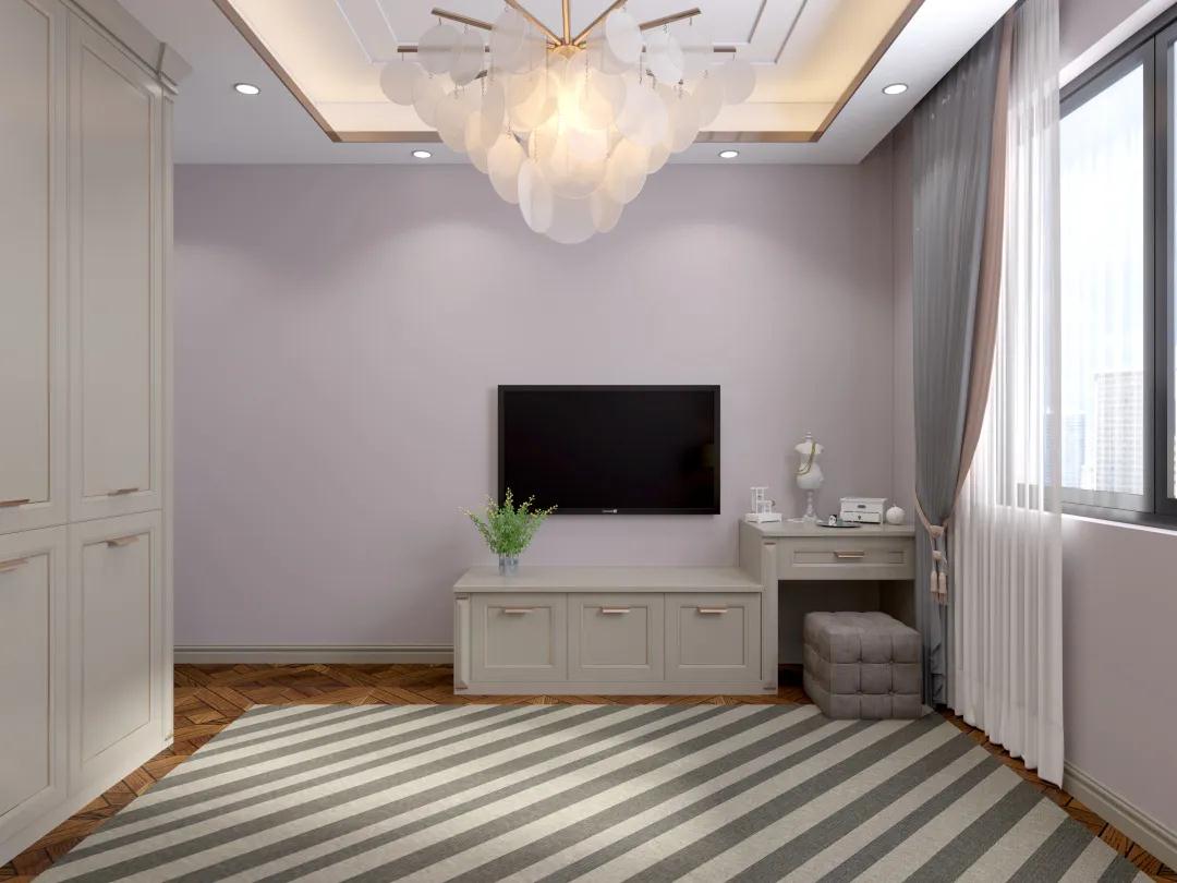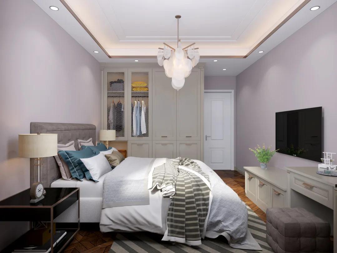 主卧室有如某个欧洲地区小寝宫,超酷银的银行柜台在浑然的渲染气氛下熠熠放光,中有欧美复古风气质的床与智能电视机柜,和衣橱相呼应;衣橱置顶设计的概念,分前后两区,或者留边透明体玻璃窗装饰性的可视地域,方便快捷生活穿着搭配实际需求。