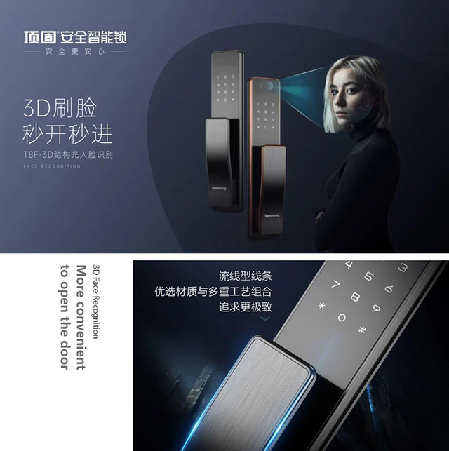 锁最为家的第一点道防线,顶固T8F-3D人像鉴别智能化锁寻求完美极致的安全性性高享受。防盗门门锁锁体均用于当下制造行业安全性性高类别更强的C级防盗门门锁与三防锁体,需要有效率制止被撬锁,直接撞门等时候;除此除外,还需要手动上线防门眼职能,让不正规的分子结构无计可施。