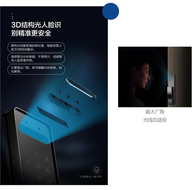 顶固T8F-3D刷脸自然快速精确自然化锁几乎是慧眼,主要采用与苹果机、付出宝同数量级的3D设备构造光水平,只需你往门口一趟,防盗车把手锁便能自然感受到并重置刷脸自然快速精确,解锁教程只在一刹那间。可是这车防盗车把手锁增配超级大广角,是有容人的“肚量”,不论什么个子矮胖瘦,都能随意自然快速精确;在昏暗环境还能做好自然光束改善,要用责怪晚防盗车把手锁不可能重置。