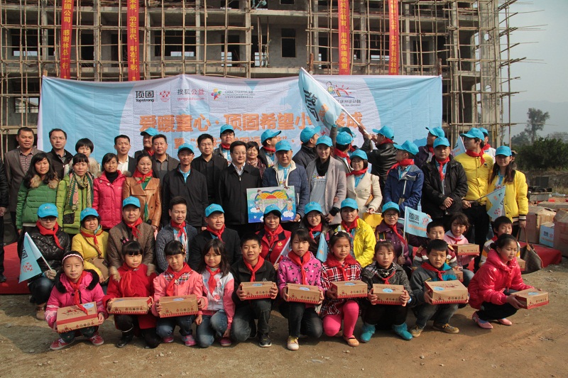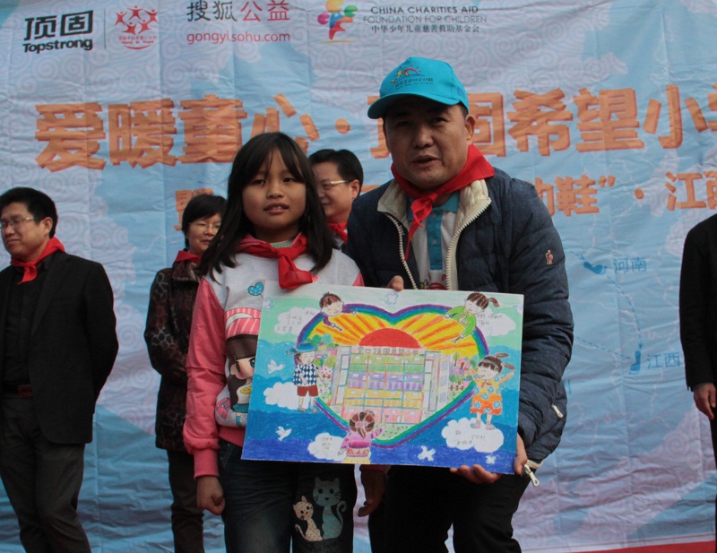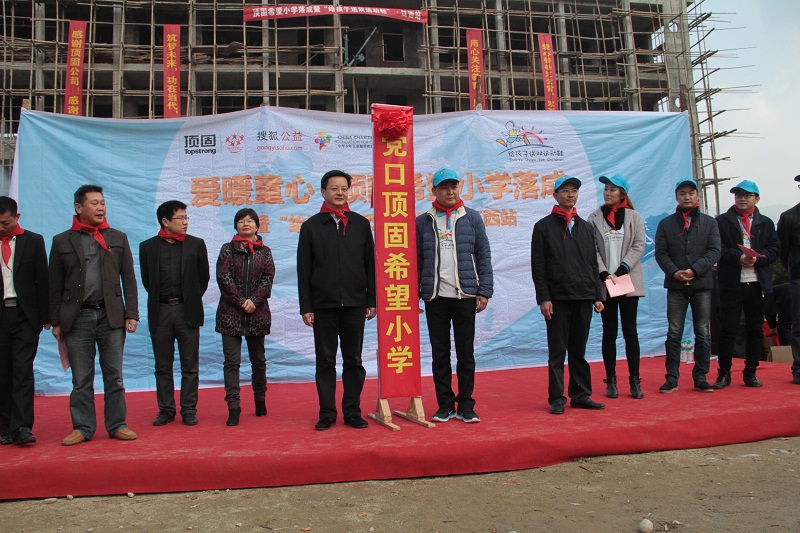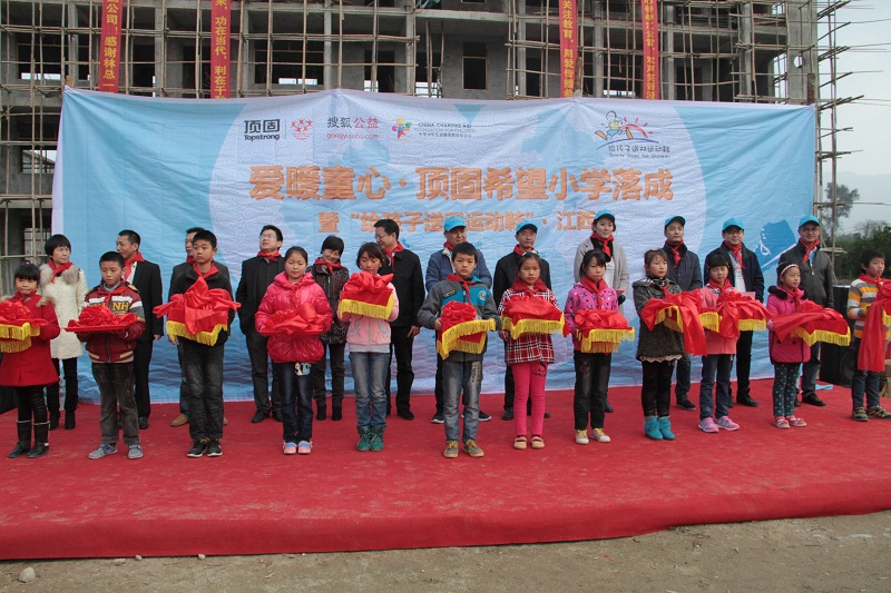 经过长达几个多小时崎岖山路兜转,顶固爱心志愿者们带着十几箱崭新的运动鞋、牛奶、文具、雨伞等爱心礼品,在孩子们的期盼与欢迎中走进了这所学校。在主持人慷慨激昂的致辞中,落成典礼正式拉开序幕。出席当天落成典礼的嘉宾分别是中共宜黄县委常委、常务副县长叶峰、人大常委副主任刘志锦、宜黄县副县长黄双龙、广东顶固集创股份有限公司董事长林新达、顶固公司汪光武、中华儿慈会代表邢星、著名歌手田华、南昌顶固总经理张志斌以及搜狐公益代表、顶固经销商代表、媒体朋友等。