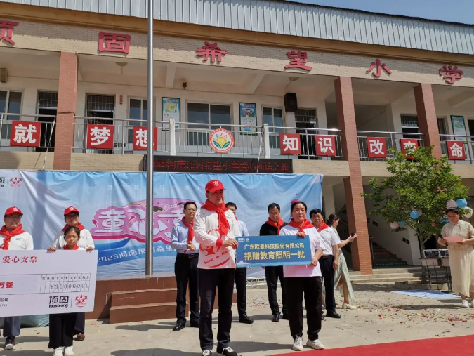 会上,出席的领导及嘉宾为河南劝门希望小学校舍灾后修缮的完成进行隆重的剪彩仪式。2021年7•20特大暴雨,顶固共捐赠了60万元,其中30万元用于劝门村的慰问,30万元顶固专项基金用于希望小学的修缮。同时,作为友好爱心企业的广东欧曼科技有限公司为学校捐赠了一批教育环保照明共6套。